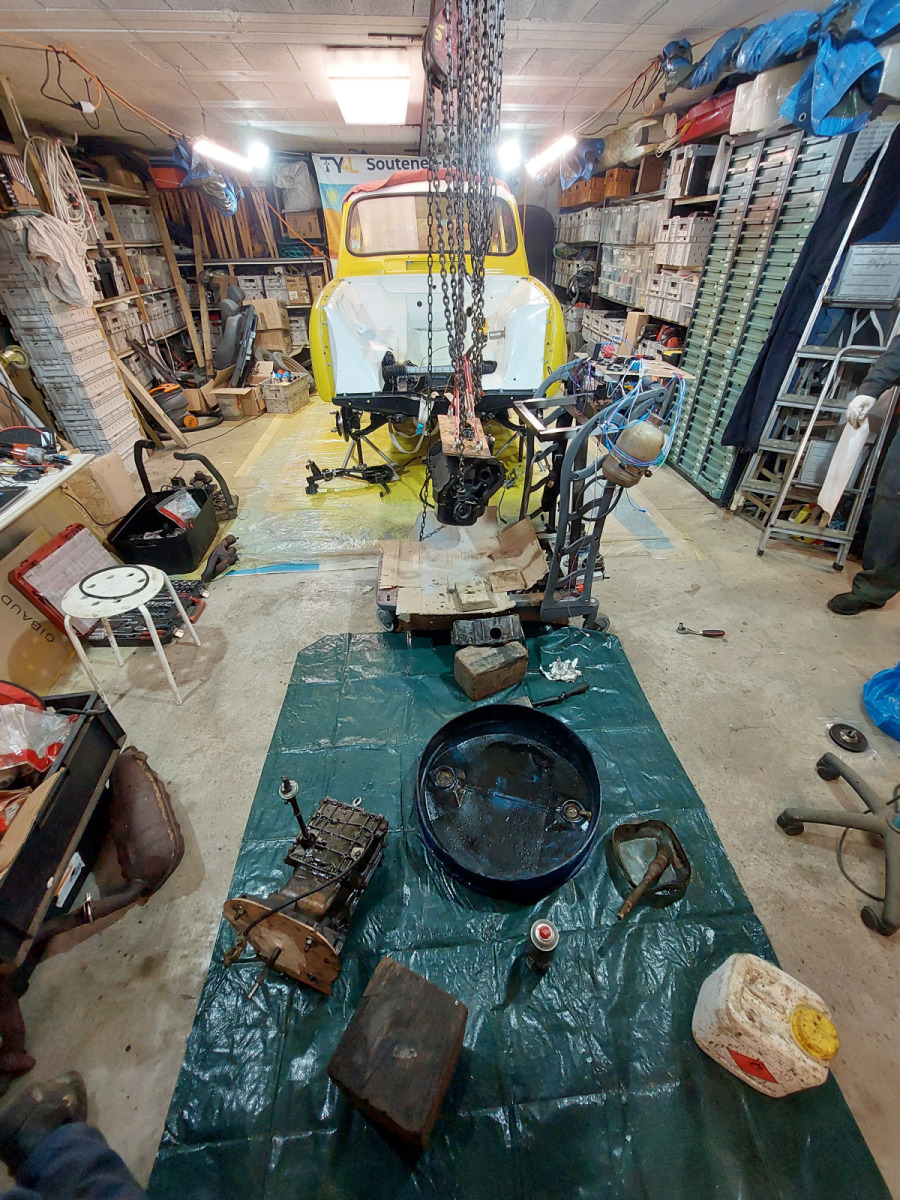 Accueil » Restauration » 4L La Bombarde » La Bombarde : Démontage du moteur Cléon 1108 cm3 de 4L