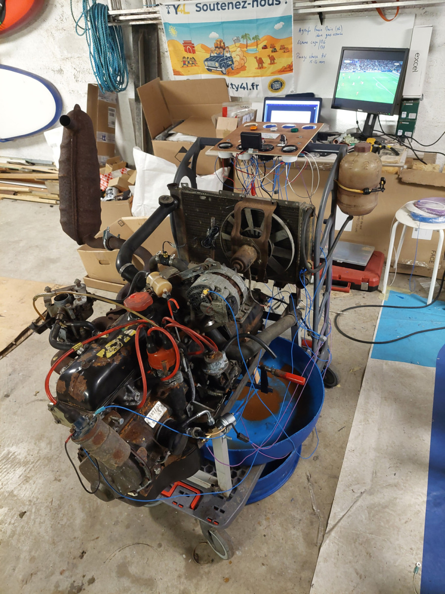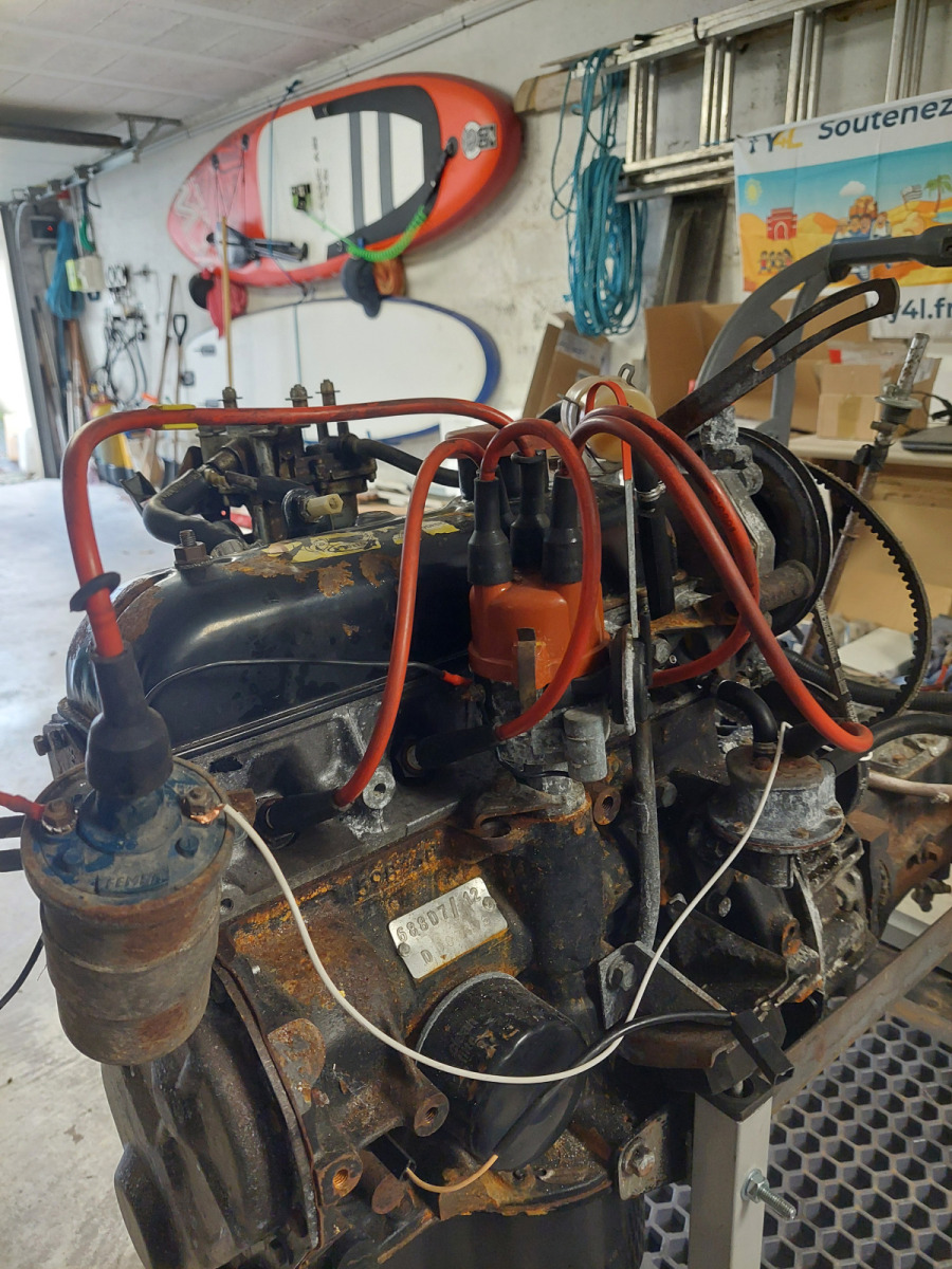 Repose du moteur dans la 4L La Bombarde : remontage dans la caisse et finalisation du compartiment moteur avant premiers essais sur route.