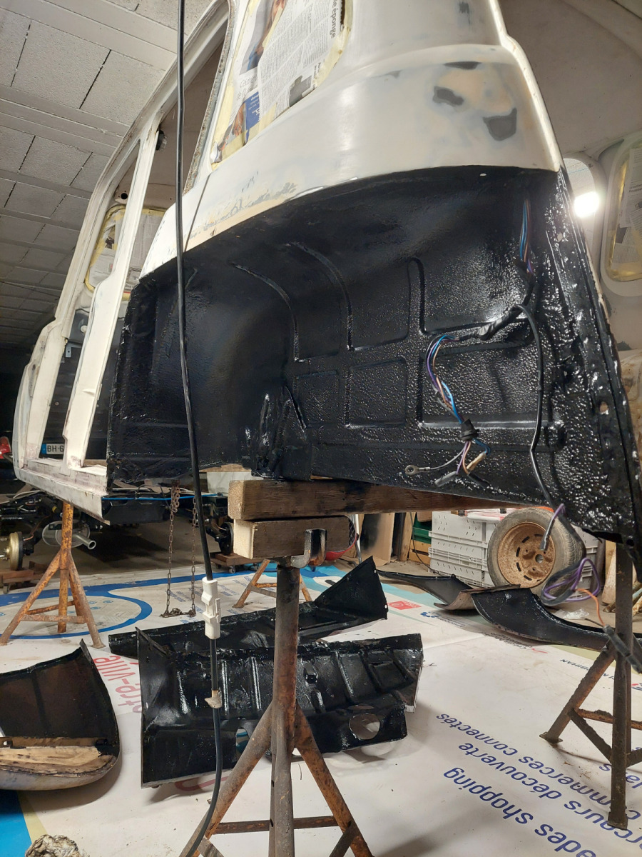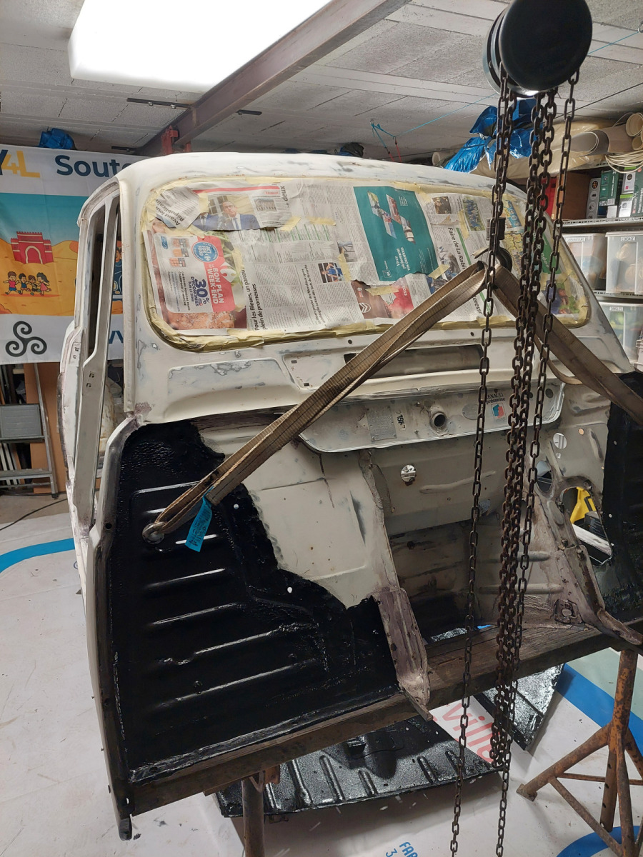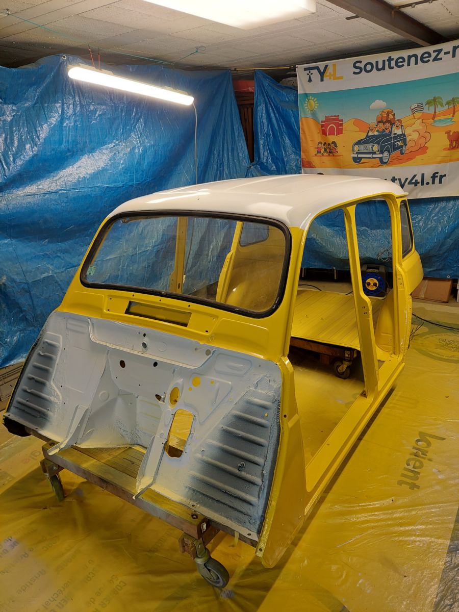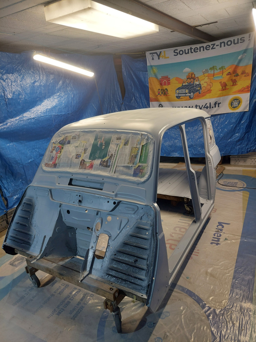 Restauration complète de la caisse de la 4L La Bombarde : ponçage, mastic, fibre de verre et résine époxy pour redonner vie à notre 4L.