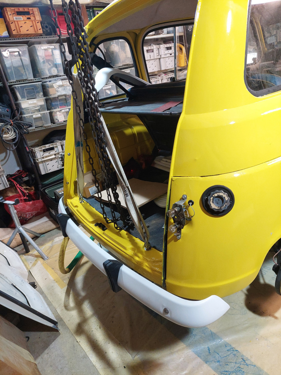 Repose du moteur dans la 4L La Bombarde : remontage dans la caisse et finalisation du compartiment moteur avant premiers essais sur route.